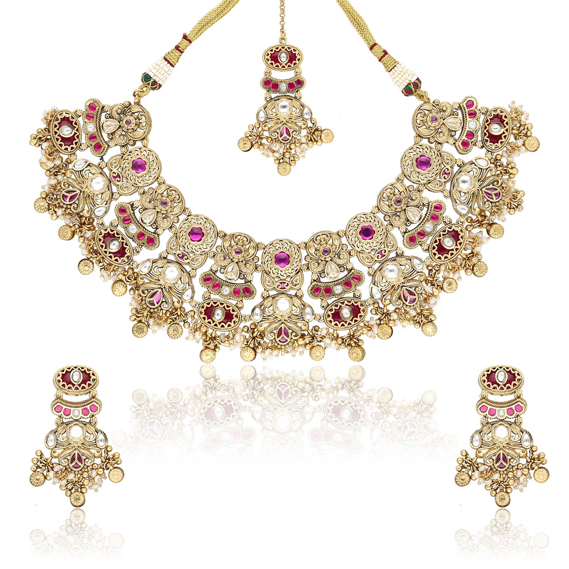 This Rajwadi / Heritage, Kundan, Pearl Antique Necklace Set in Ruby & White Color for Women available in Free Size.