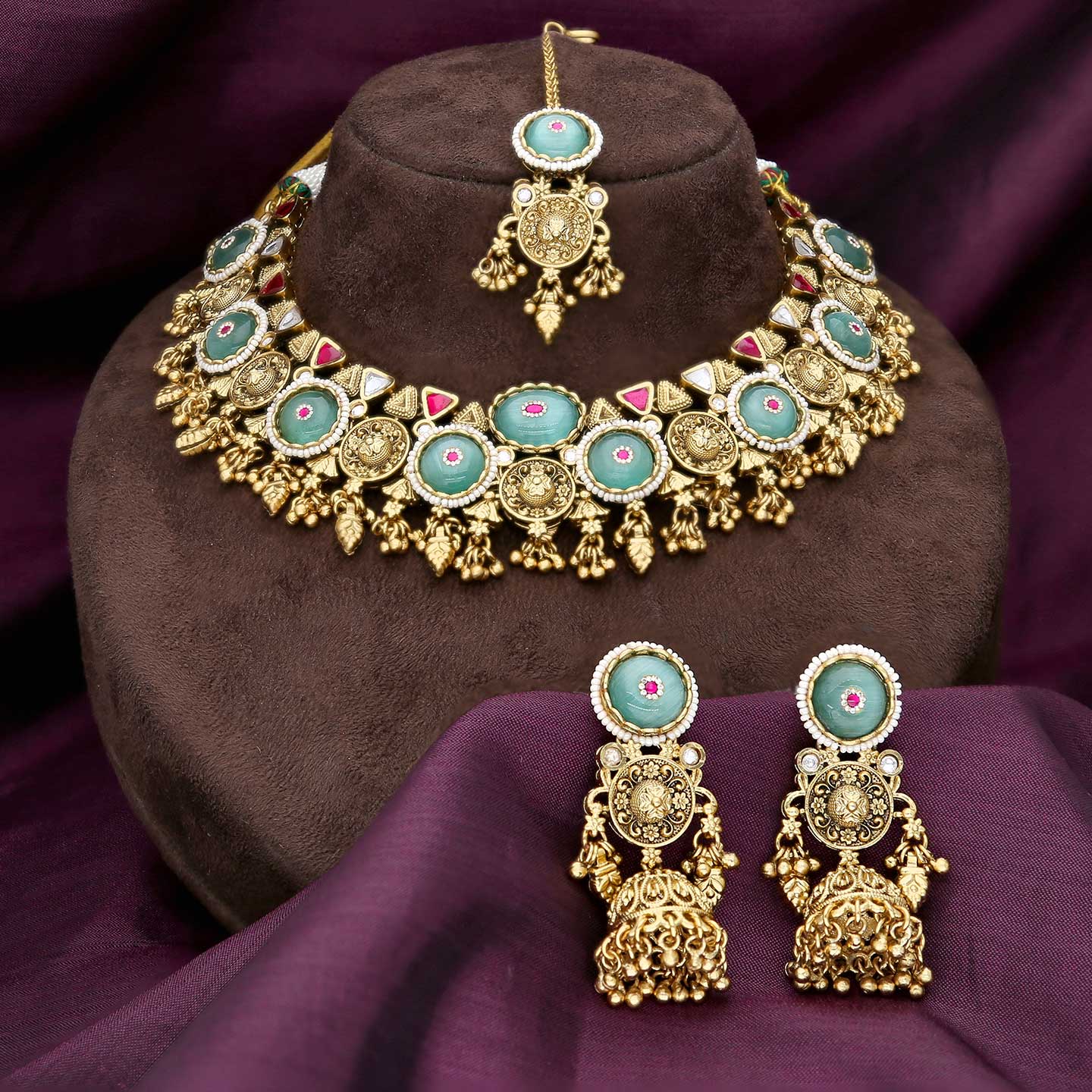 This Rajwadi / Heritage, Kundan, Pearl Designer Necklace Set in Ruby & Green Color for Women available in Free Size.