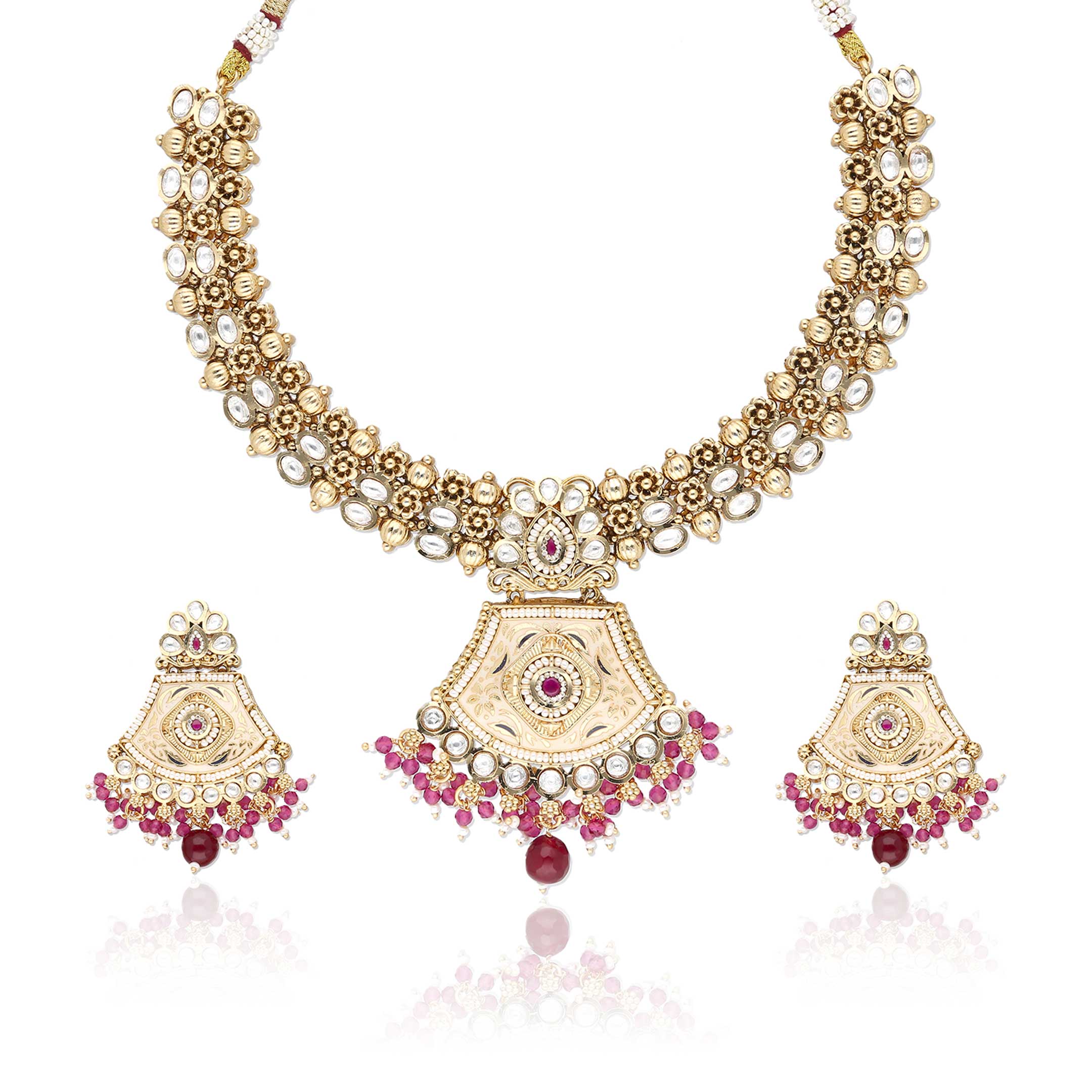 This Rajwadi / Heritage, Kundan, Pearl Designer Necklace Set in Ruby & White Color for Women available in Free Size.