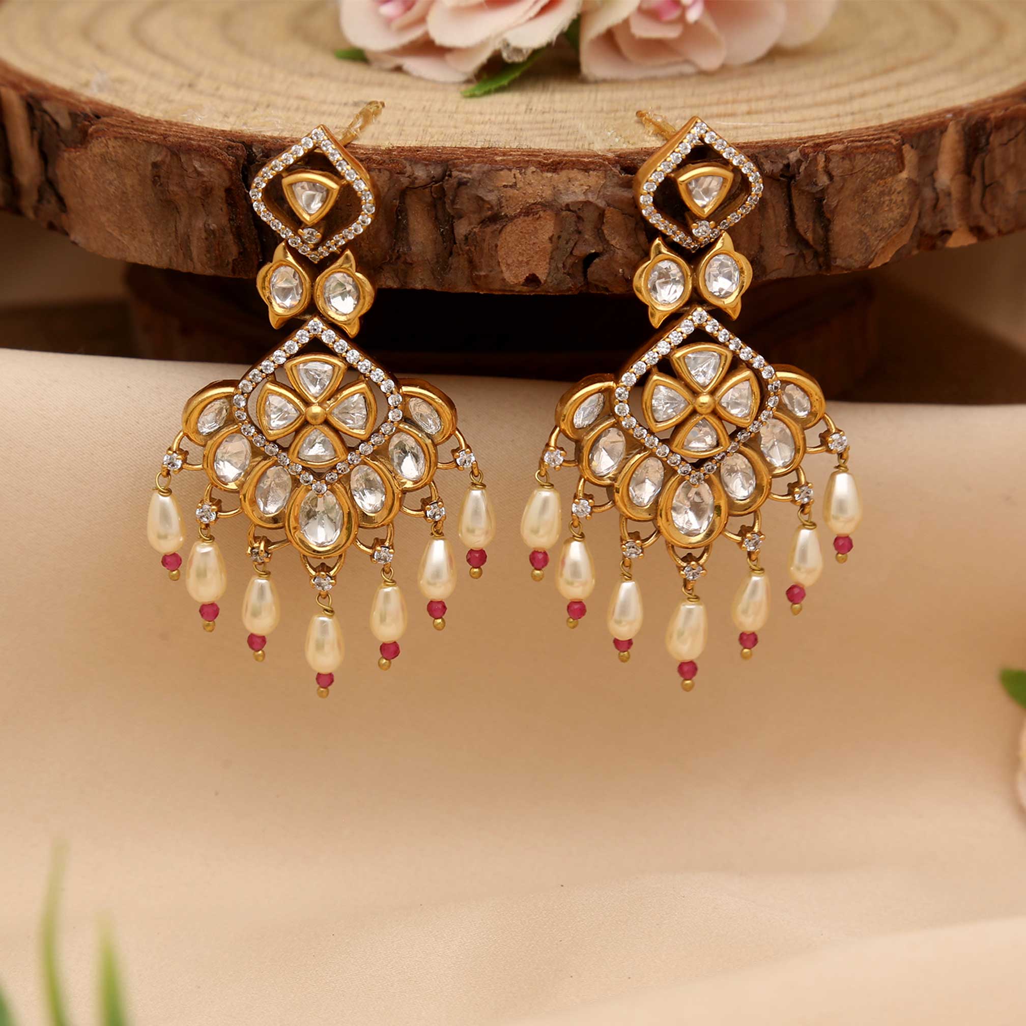This AD / CZ, Kundan, Pearl Kundan Pearl Earrings in Ruby & White Color for Women available in Long (Above 2.5 in) Size.