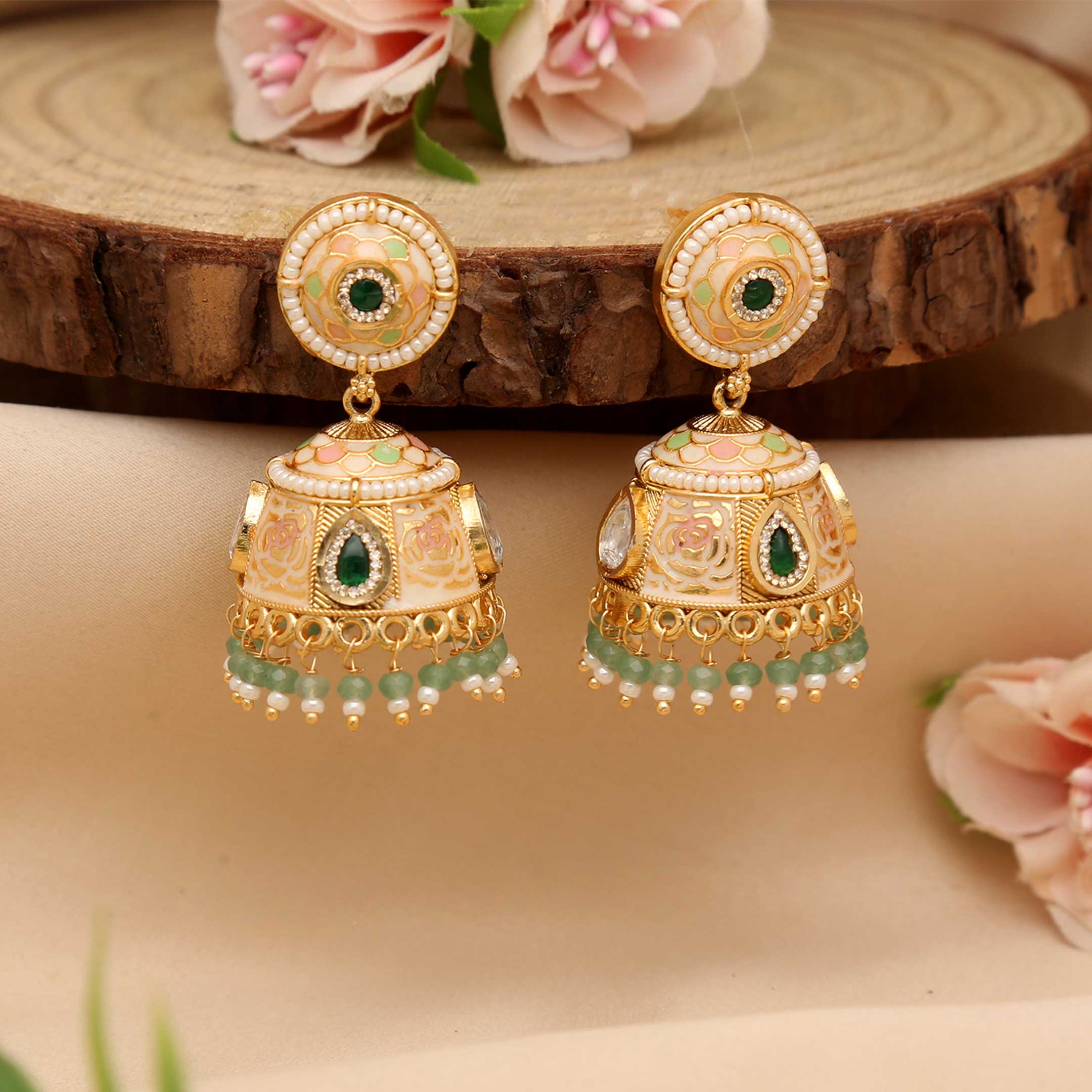 This Kundan, Pearl Meenakari Jhumka Earrings in White & Green Color for Women available in Medium (1 in to 2.5 in) Size.