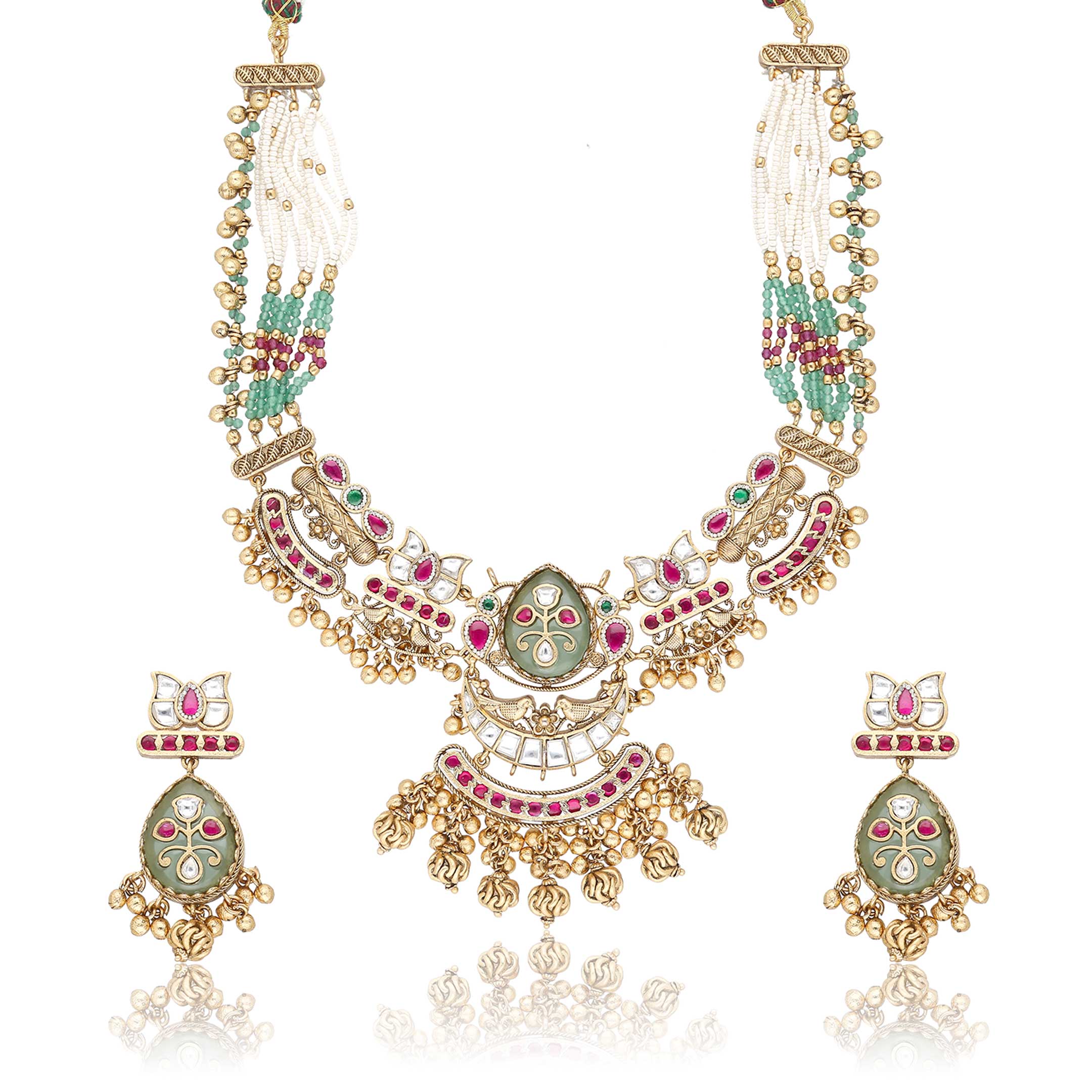 This Rajwadi / Heritage, Kundan, Pearl Polki Necklace Set in Ruby & Green Color for Women available in Free Size.