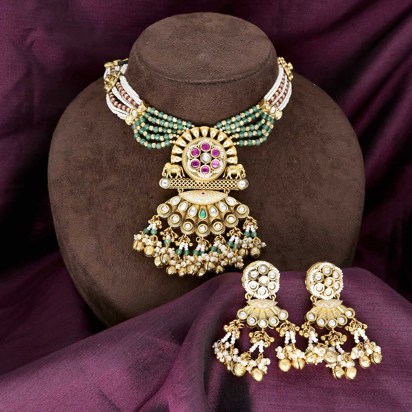 This Rajwadi / Heritage, Kundan, Pearl Rajwadi Jewellery Set in Ruby & Green Color for Women available in 24 in Size.